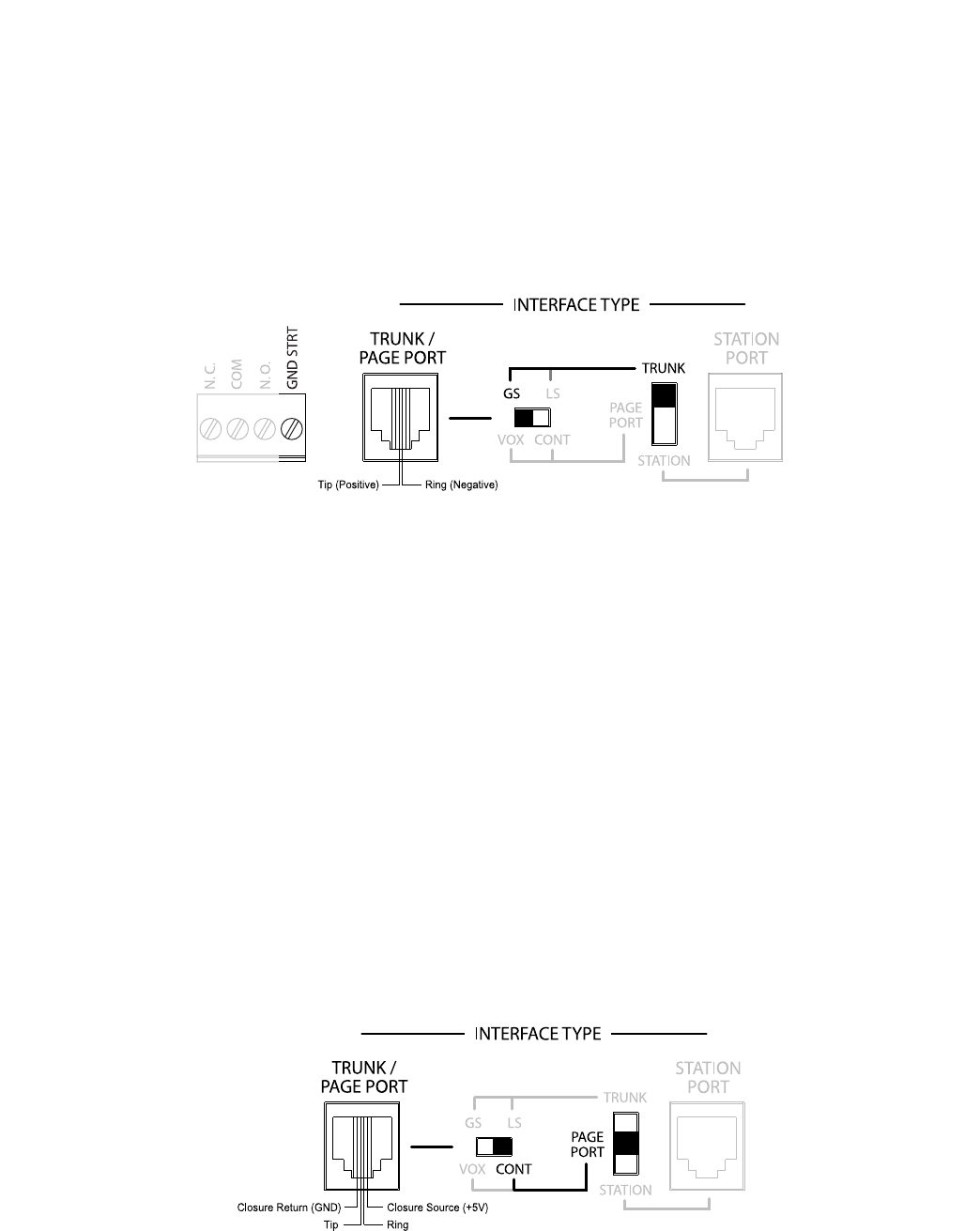 return terminals for the Trunk/Page Port jack, the contact closure (GND), the left-most Dry Audio input terminal